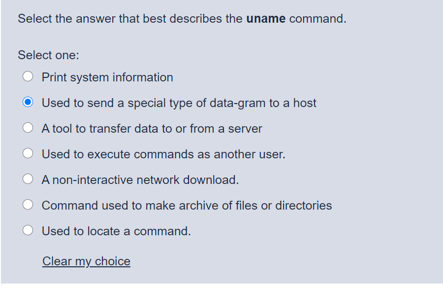 This is used to display the version of the wget available on your system. O Used to send a special type of data-gram to a host. O Used to send a special type of data-gram to a host O Command used to make archive of files or directories Used to locate a command.